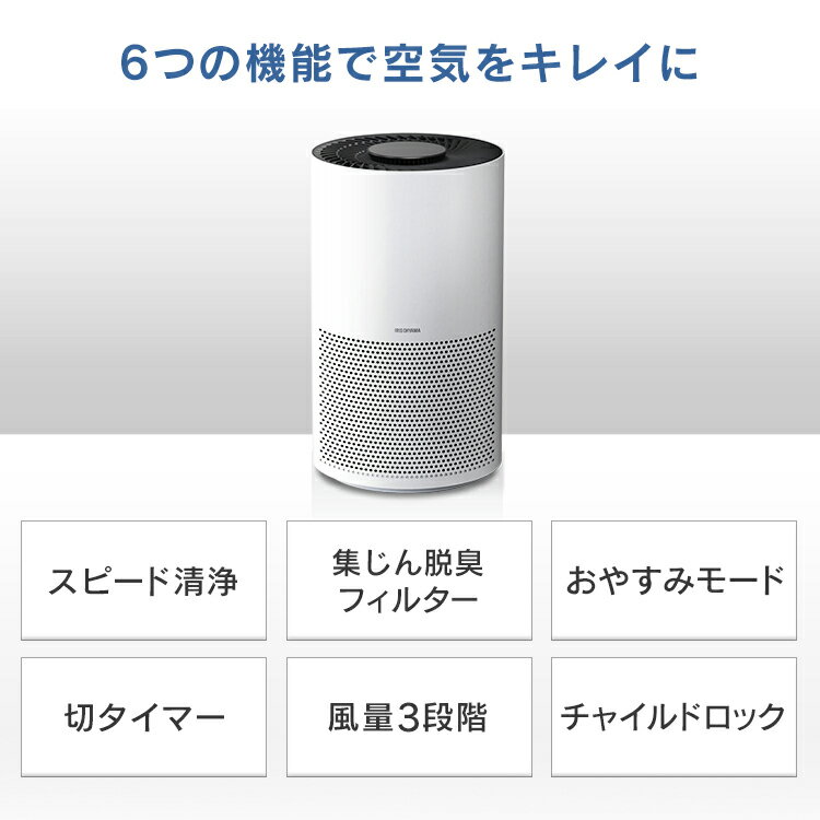 ●サイズ(mm)幅約238×奥行約238×高さ約410●定格電源AC100V、50/60Hz●消費電力おやすみ(最小):6/7W強(最大):37/46W●風量おやすみ(最小):0.9/1.0立方メートル/分強(最大):3.5/3.4立方メートル/分●運転音おやすみ(最小):22/22dB強(最大):50/49dB●適用床面積26平方メートル(16畳)●質量約3.3kg●電源コード長約1.8m(検索用:効果 におい ほこり 花粉 ハウスダスト ウイルス 除去 静音 空気清浄機 省エネ 静か 家電 新生活 黄砂 PM2.5対応 空気清浄機 アイリスオーヤマ 10畳 脱臭 4967576496674)★